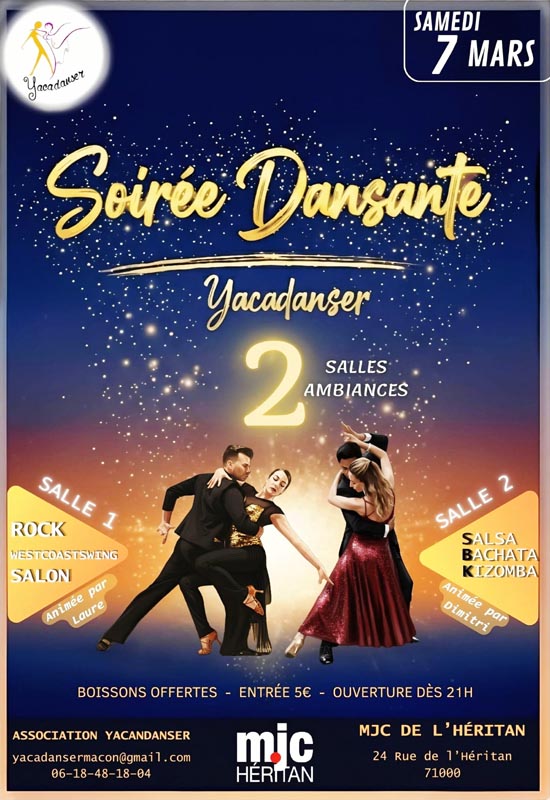 C'est le grand retour de nos soirées à la MJC de l'Héritan !!! Nous sommes heureux de vous retrouver pour notre soirée 2 salles 2 ambiances SURPRISE : initiation West Coast Swing par Seb offerte de 21h15 à 22h Mesdames, cette fois, on vous invite à prendre l'initiative et à inviter les cavaliers à danser...